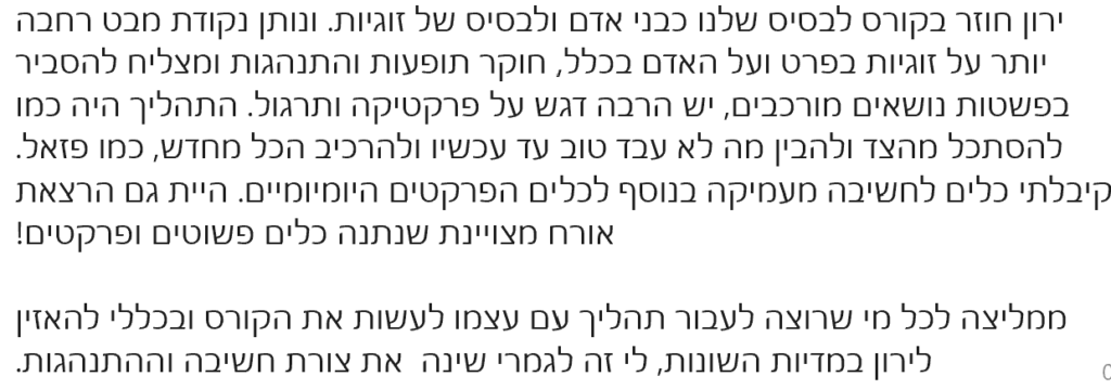 “כבר שנים, מאז שהכרנו, בכל פעם שאני מסתכלת על ירון, אני רואה: נחישות, אמונה , סקרנות, חקירה מעמיקה בנושא הדינמיקה הרגשית הרומנטית. אני מאמינה שהתכונות האלה הן תכונות הכרחיות כדי להיות טוב במה שאתה עושה. מתוך החוויה האישית שלו, לומד, מיישם, משקיע זמן והרבה אהבה, אמונה, ולמידה בתחום”